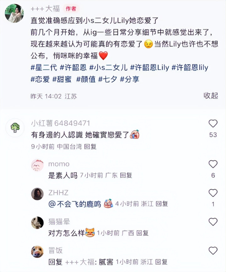 这条猜测发布后,有IP地址是台湾省的知情人回复称,有身边的人认识,她确实恋爱了。
